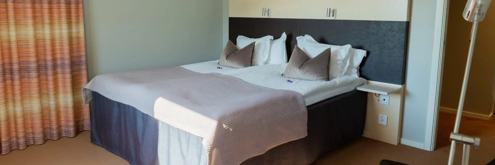 The combi room is on the third floor and has a view of the lake. It is extra spacious for those who travel together and is perfect for a large family or several friends. The room is 40 m2 and has a bedroom with a 180 cm wide double bed. The living room has a sleeping alcove with a 140 cm wide bed that is separated by a curtain. The living room also has a sofa bed that is 90 cm wide and a footstool that can be used as a bed 80 cm wide. There is also a table with 4 chairs. Fully tiled bathroom with shower. Minibar, hairdryer, Wi-Fi, TV and air-conditioning. Ironing board and iron are available to borrow for the room. Subject to availability, you can pre-book a cot for an extra fee.